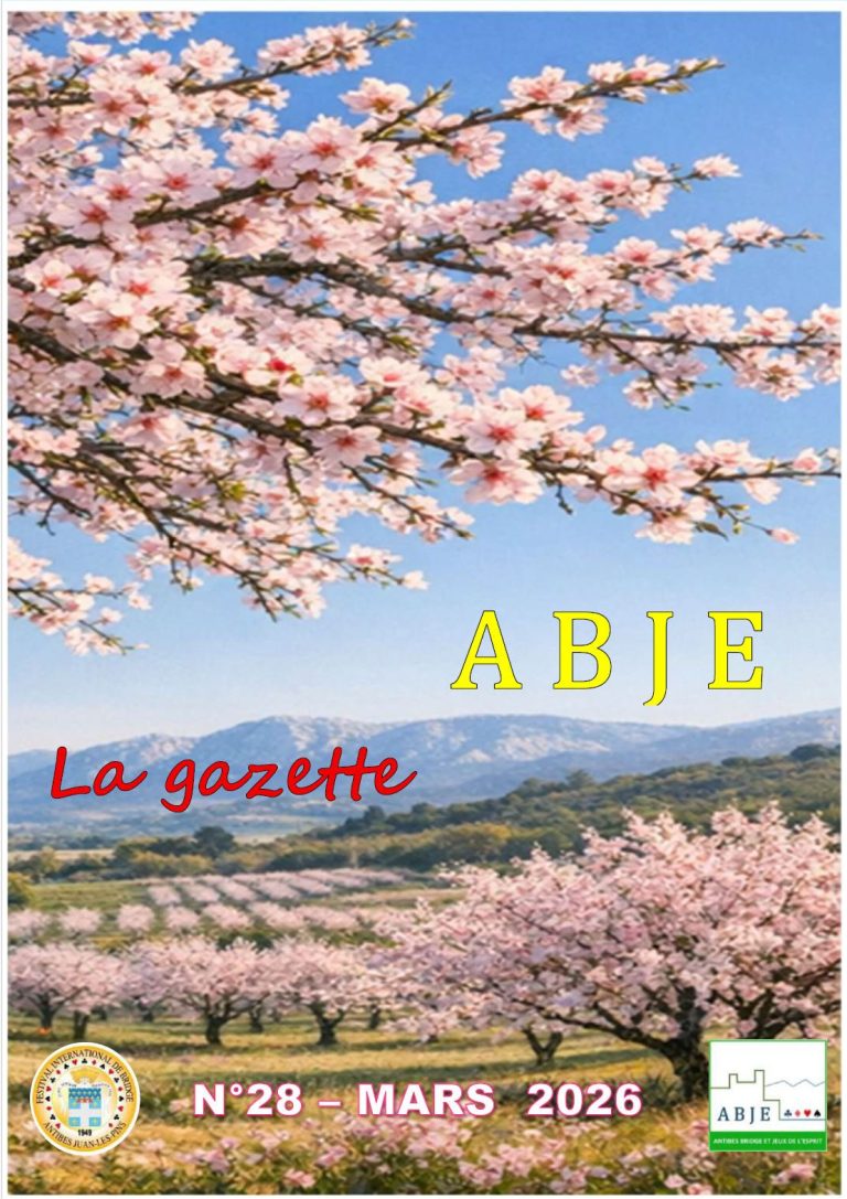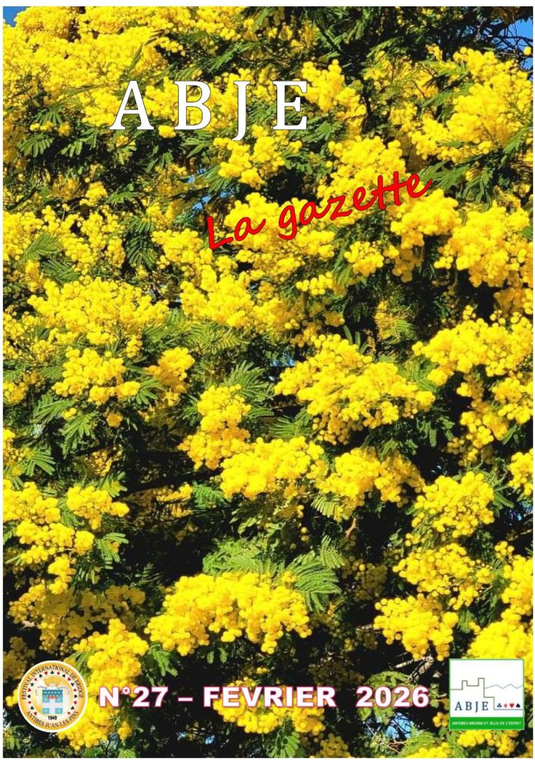L’ABJE se doit de faire du Festival International de Bridge de Juan Les Pins une grande réussite. Nous aurons besoin de votre participation massive et spécialement pour le TOURNOI PROVENÇAL du vendredi 3 mai, qui marquera l’ouverture du FESTIVAL DU SOLEIL. Ce festival international est un évènement majeur pour notre club, et pour la Ville d’Antibes.